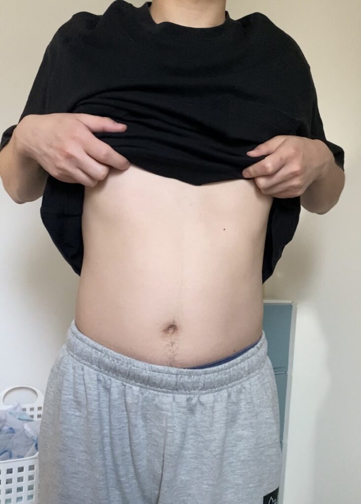 多少、お腹のふくらみは減ったように感じますが大きな変化はありません。服を着てしまえば分からない程度の変化かなと思います。